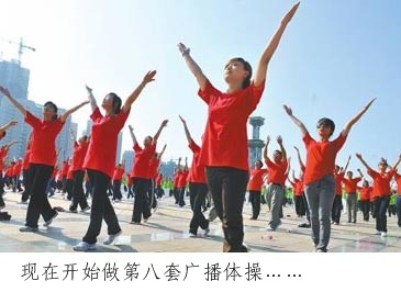 北京恢復廣播體操的行動(dòng)已經(jīng)推廣開(kāi)來(lái),工間操的開(kāi)展情況還將成為相關(guān)單位一把手的考核指標之一。大家看著(zhù)電視上播出某公司工間操的視頻,有人說(shuō):“活動(dòng)活動(dòng),換換腦筋,真不錯”;也有人說(shuō):“政府有這點(diǎn)兒精力,多建點(diǎn)兒公共體育場(chǎng)館好不好”。