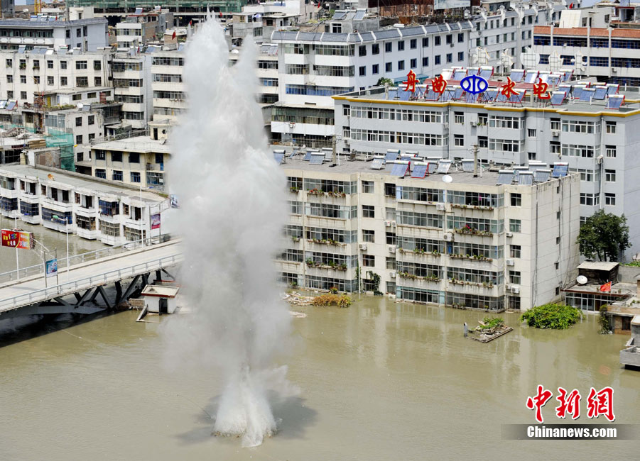 8月10日,甘肅舟曲泥石流災區,蘭州軍區開(kāi)山斧工兵團在泥石流造成的白龍江堰塞湖壩體上實(shí)施爆破。中新社發(fā) 廖攀 攝
