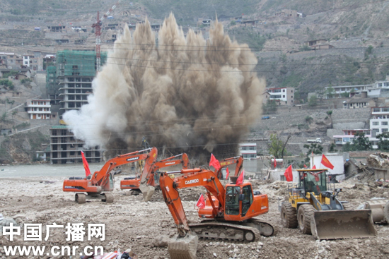 26日,部隊投入白龍江疏浚 。爆破與機械施工同時(shí)展開(kāi)