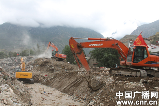 由于特大山洪泥石流將羅家峪至濱河路原有的泄洪渠堵塞抬高,致使排水不暢。一旦再次爆發(fā)山洪,便無(wú)法安全排放到白龍江,將導致次生災害。在搶通道路后,突擊隊來(lái)不及半刻休息,從13日開(kāi)始,充分發(fā)揮大型機械設備專(zhuān)業(yè)化優(yōu)勢,在羅家峪泥石流堆積區展開(kāi)搶挖工作。 由于淤泥方量巨大,且非常松軟承載力弱,加之作業(yè)地區地形狹窄、作業(yè)面小,給清淤工作帶來(lái)了諸多不便。突擊隊采取多點(diǎn)作業(yè)、逐層開(kāi)挖、人機配合的方法,確保清淤工作高效推進(jìn)。經(jīng)過(guò)72小時(shí)揮汗如雨的奮戰,到19日19時(shí),長(cháng)2.5公里的羅家峪導流明渠全線(xiàn)貫通,具備了泄洪能力。