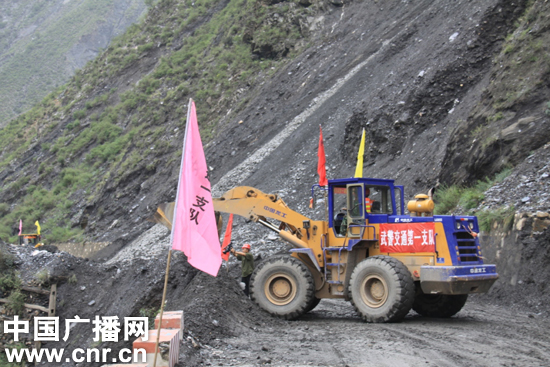 8日5時(shí),接到命令的一支隊九中隊中隊長(cháng)李立剛在就開(kāi)始奔赴災區,不到30分鐘,由20人和2臺挖掘機、1臺裝載機組成的搶險突擊隊集結完畢。滂沱大雨中,突擊隊邊清理路上的塌方泥石流,邊火速趕往災區。流經(jīng)過(guò)4個(gè)多小時(shí)的急行軍,8日9時(shí),搶險突擊隊到達舟曲縣城,立即投入搶險戰斗。與此同時(shí),距舟曲約300公里,在甘南州卓尼縣S306線(xiàn)施工的一支隊三大隊教導員胡金良,也50名官兵,攜帶6臺大型機械緊急趕赴迭部縣九道彎處清理塌方,全力搶通蘭州通往災區的道路!拔覀冊缫环昼姷竭_,災區人民就多一分希望!睘楸M快打通被泥石流阻斷的313線(xiàn)舟曲縣城濱河南路段,黨員搶險突擊隊隊隊長(cháng)余志河站在裝載機上,拿著(zhù)大喇叭不斷給官兵們打氣。
