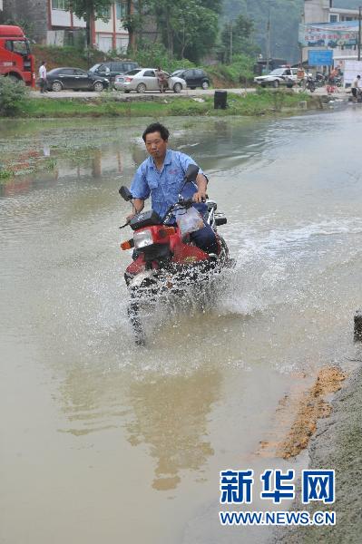 6月21日,在貴州省遵義市正安縣樂(lè )儉鄉,一村民駕車(chē)從積滿(mǎn)水的公路上經(jīng)過(guò)。 新華社記者歐東衢攝