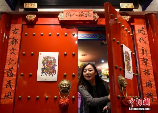 1月27日,由文化和旅游部恭王府博物館和中國文化傳媒集團主辦的“年畫(huà)重回春節”系列活動(dòng)在北京老舍茶館拉開(kāi)序幕,圖為一名市民走出活動(dòng)現場(chǎng)。中新社記者 侯宇 攝