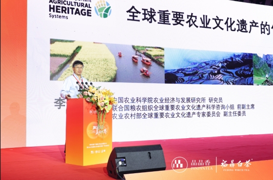 現場(chǎng)還延請兩位權威專(zhuān)家作專(zhuān)題分享。中國農科院農業(yè)經(jīng)濟與發(fā)展研究所研究員、聯(lián)合國糧農組織全球重要農業(yè)文化遺產(chǎn)科學(xué)咨詢(xún)小組前副主席李先德以《全球重要農業(yè)文化遺產(chǎn)的傳承和發(fā)展》為題,結合全球農遺標準與福鼎實(shí)踐,指出“福建福鼎白茶文化系統”的核心特征——提供食物營(yíng)養與生計安全保障、擁有豐富的農業(yè)生物多樣性、當地傳統知識與技術(shù)體系、極具地方特色的茶文化、多樣迷人的茶園景觀(guān)。同時(shí)提出保護端需守護茶樹(shù)種質(zhì)、傳統技藝與習俗;發(fā)展端要打造高端特色產(chǎn)品、探索茶文旅融合,并構建“政府-企業(yè)-合作社-茶農”多方利益共享機制,保障福鼎白茶可持續發(fā)展。
