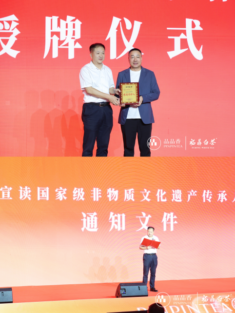 活動(dòng)現場(chǎng)還舉行了授牌儀式。福鼎市人大常委會(huì )主任、福鼎市茶產(chǎn)業(yè)發(fā)展領(lǐng)導小組常務(wù)副組長(cháng) 蔡梅生現場(chǎng)宣讀、福建品品香茶業(yè)有限公司董事長(cháng)林振傳入選國家級“非遺傳人”的通知文件,并授予林振傳董事長(cháng)“農遺守護人”榮譽(yù)稱(chēng)號。