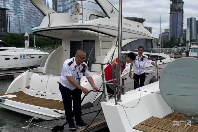 廈門(mén)海事局執法人員在游艇碼頭檢查游艇系泊情況(央廣網(wǎng)發(fā) 廈門(mén)海事局供圖)