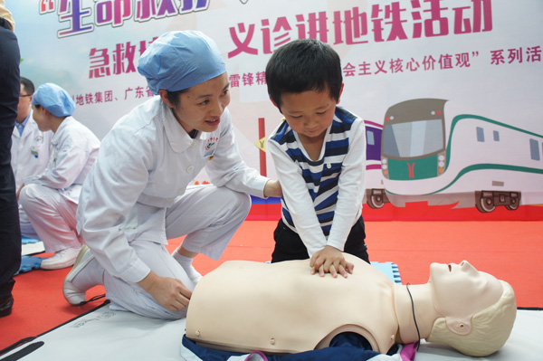 據南方網(wǎng)報道,乘坐地鐵時(shí),當你身邊的人突然發(fā)病暈倒,該如何幫助他們?3月5日,在第五十五個(gè)學(xué)雷鋒紀念日到來(lái)之際,廣州地鐵集團與廣東省中醫院攜手在公園前地鐵站舉辦了“生命救護、平安隨行 急救培訓進(jìn)地鐵”活動(dòng),并在6座地鐵站現場(chǎng)開(kāi)展急救培訓和演練,將“急救白金十分鐘”的理念和技能“送”進(jìn)地鐵,讓車(chē)站人員和乘客掌握心肺復蘇急救術(shù),并在突發(fā)事件中能成為“急救醫師”。