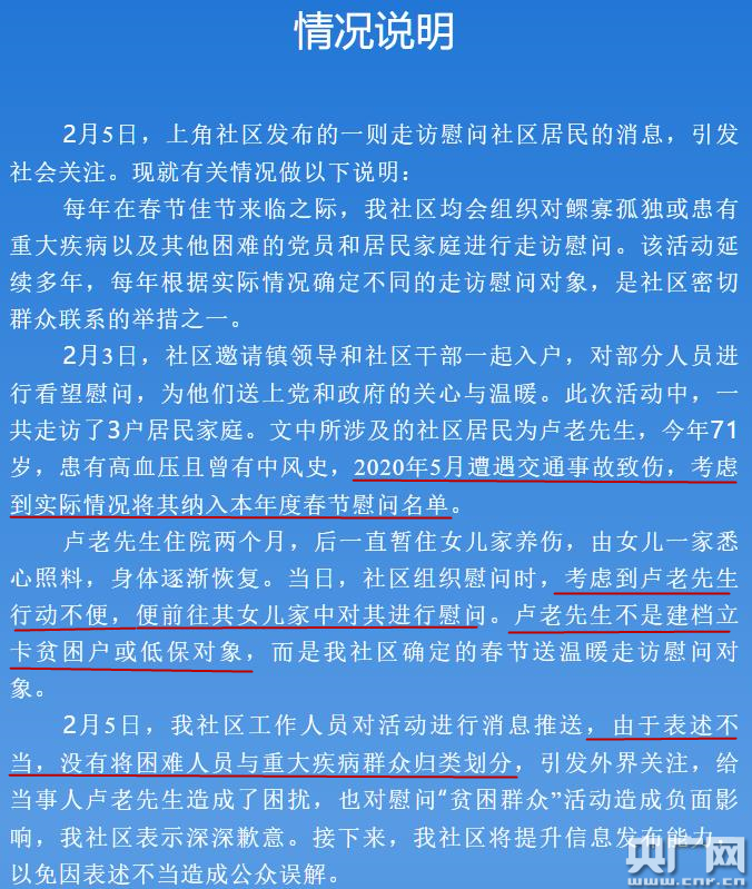 根據2月6日發(fā)布的情況說(shuō)明,文中所涉及的社區居民盧老先生,今年71歲,患有高血壓且曾有中風(fēng)史,2020年5月遭遇交通事故致傷,不是建檔立卡貧困戶(hù)或低保對象,而是該社區確定的春節送溫暖走訪(fǎng)慰問(wèn)對象。