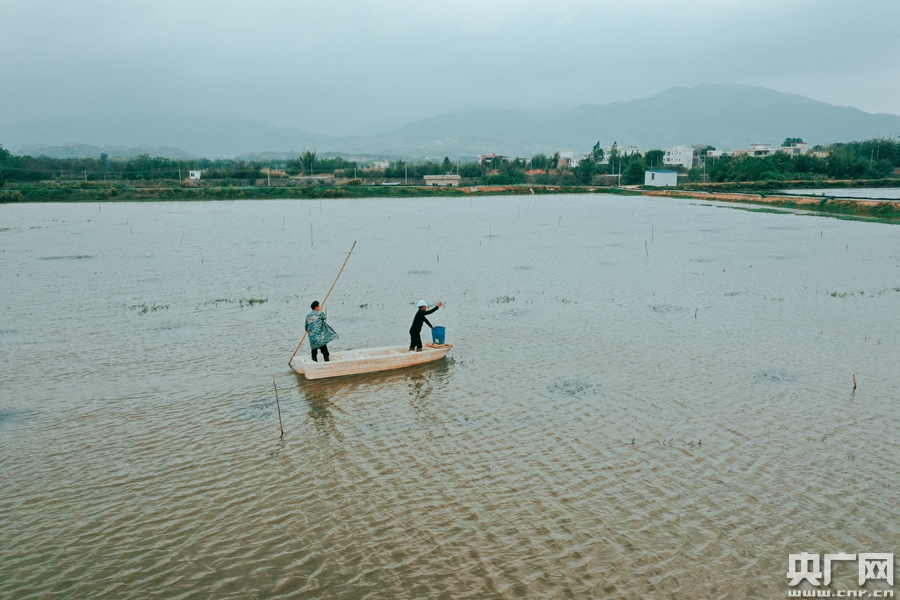 養殖戶(hù)正在投喂蝦食。(央廣網(wǎng)記者 官文清攝)
