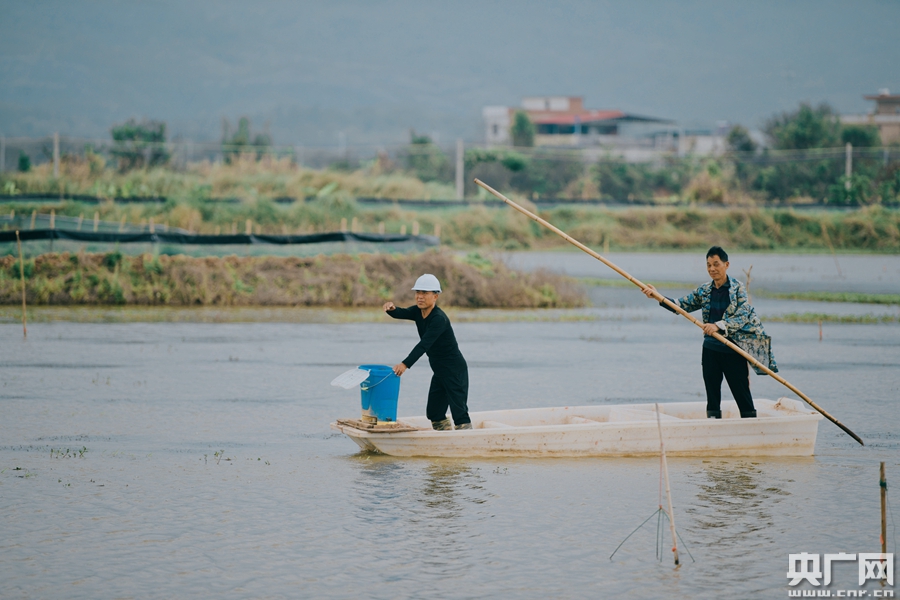 養殖戶(hù)乘坐小船駛過(guò)稻蝦田。(央廣網(wǎng)記者 官文清攝)