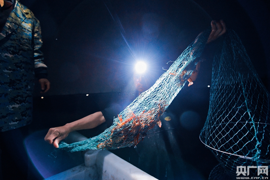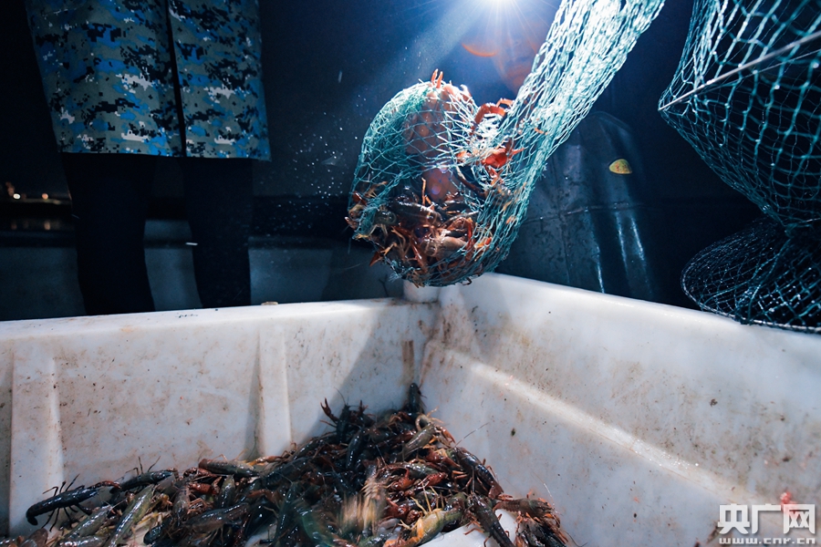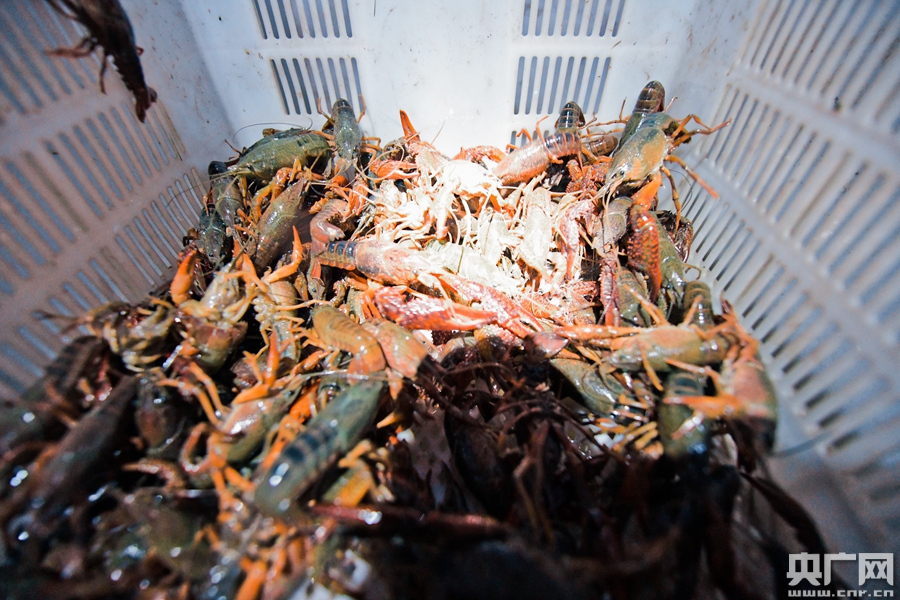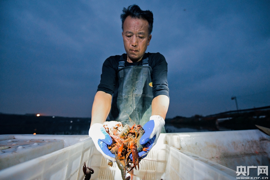 為了能讓小龍蝦盡早端上消費者的餐桌,養殖戶(hù)需要在凌晨將小龍蝦捕撈上岸。(央廣網(wǎng)記者 官文清攝)