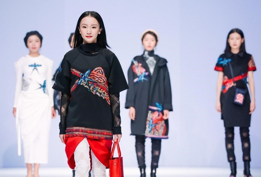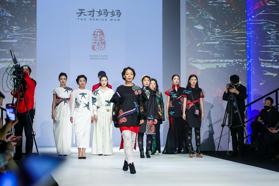 公益時(shí)裝秀以“民族等于潮流”為設計主題,將東鄉繡娘的民族傳統繡片與現代電腦印花及繡花結合貫穿整場(chǎng)發(fā)布。