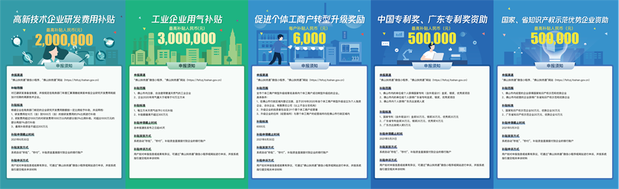 據了解,本次惠企補貼包含高新技術(shù)企業(yè)研發(fā)費用補貼、工業(yè)企業(yè)用氣補貼、促進(jìn)個(gè)體工商戶(hù)轉型升級補貼、中國專(zhuān)利獎、廣東專(zhuān)利獎資助以及國家、省知識產(chǎn)權示范優(yōu)勢企業(yè)資助,符合要求的企業(yè)只需登錄“佛山扶持通”,即可申領(lǐng)最高可達300萬(wàn)元的補貼資金。