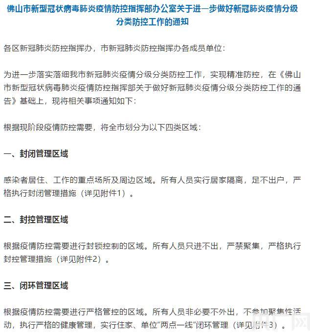 央廣網(wǎng)佛山6月6日消息(記者 夏燕)6月5日晚,佛山市新型冠狀病毒肺炎疫情防控指揮部辦公室發(fā)布通知,即日起實(shí)施分級分類(lèi)防控,將全市劃分為封閉管理、封控管理、閉環(huán)管理及一般管理共四類(lèi)區域。