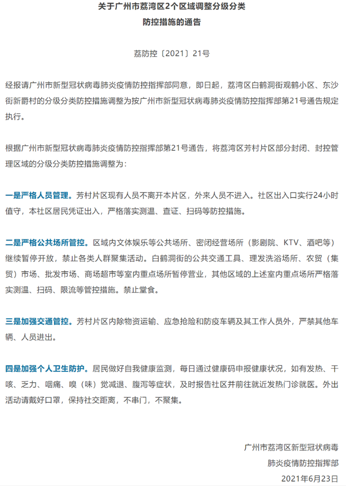 央廣網(wǎng)廣州6月23日消息(記者 張勝強)6月23日晚,記者從廣州市衛生健康委員會(huì )獲悉,自2021年6月23日起,廣州市部分區域疫情風(fēng)險等級調整如下: