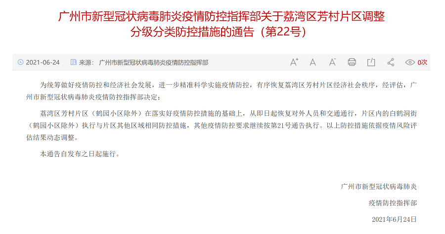 央廣網(wǎng)廣州6月24日消息(記者 張勝強)6月24日下午,廣州市新型冠狀病毒肺炎疫情防控指揮部發(fā)布荔灣區芳村片區調整分級分類(lèi)防控措施的通告(第22號),通告指出,荔灣區芳村片區(鶴園小區除外)在落實(shí)好疫情防控措施的基礎上,從即日起恢復對外人員和交通通行,片區內的白鶴洞街(鶴園小區除外)執行與片區其他區域相同防控措施,其他疫情防控要求繼續按第21號通告執行。以上防控措施依據疫情風(fēng)險評估結果動(dòng)態(tài)調整。