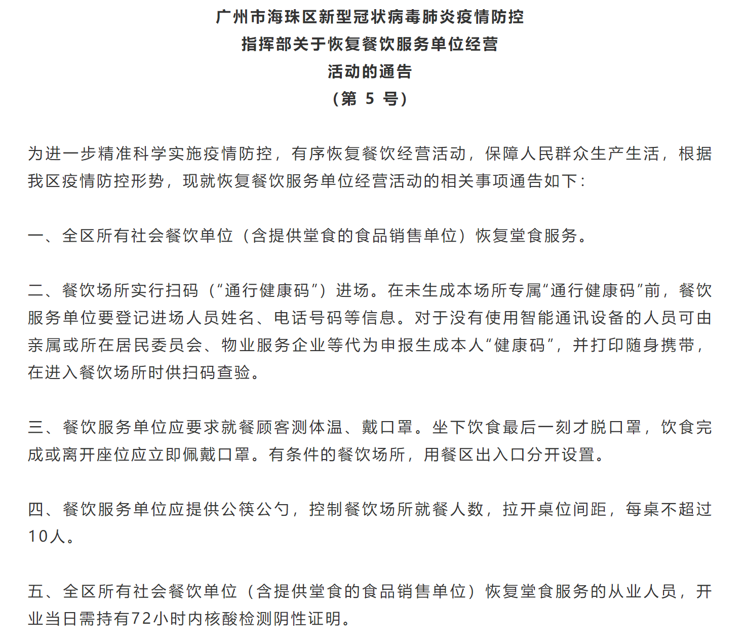 一、除珠江街嘉安花園以及珠江街靈新大道以東、工業(yè)路一巷以南、六涌以北區域禁止堂食外,全區其他區域的餐飲服務(wù)單位(含提供堂食的食品銷(xiāo)售單位)從6月26日起恢復堂食服務(wù)。