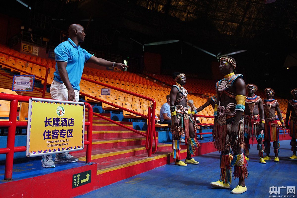 作為大馬戲的串場(chǎng)節目之一,每當夜幕降臨,在觀(guān)眾席的過(guò)道上,有這么一群人在其中載歌載舞。其中一項節目便是肯尼亞舞蹈節目,該節目領(lǐng)隊丹尼斯(肯尼亞籍),今年45歲,在長(cháng)隆生活已經(jīng)10年有余,能夠熟練用中文和廣東話(huà)與人交流,妻子杰夫妮(肯尼亞籍)常年伴隨左右,他們有一個(gè)21歲的女兒安吉娜,現在也在中國生活。