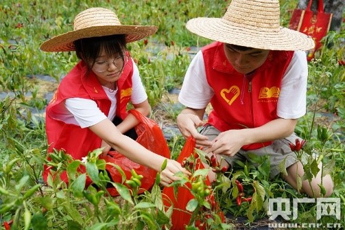 志愿者采摘辣椒。(央廣網(wǎng)發(fā) 鄧仕華 攝)