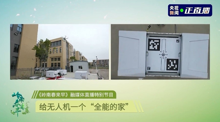 正在降落的無(wú)人機和它“全能的家”——“機巢”。