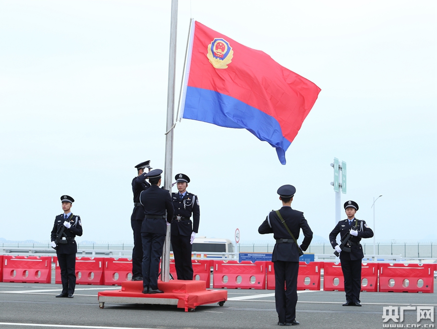 “向警旗敬禮!”全體民警神情莊重,整齊敬禮,飽含真摯情感,齊唱警歌,表達著(zhù)對黨對祖國對人民的無(wú)限忠誠和熱愛(ài)。紅藍相間的人民警察警旗緩緩升起,在海天一色的港珠澳大橋上空獵獵飄揚,格外耀眼。