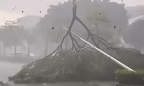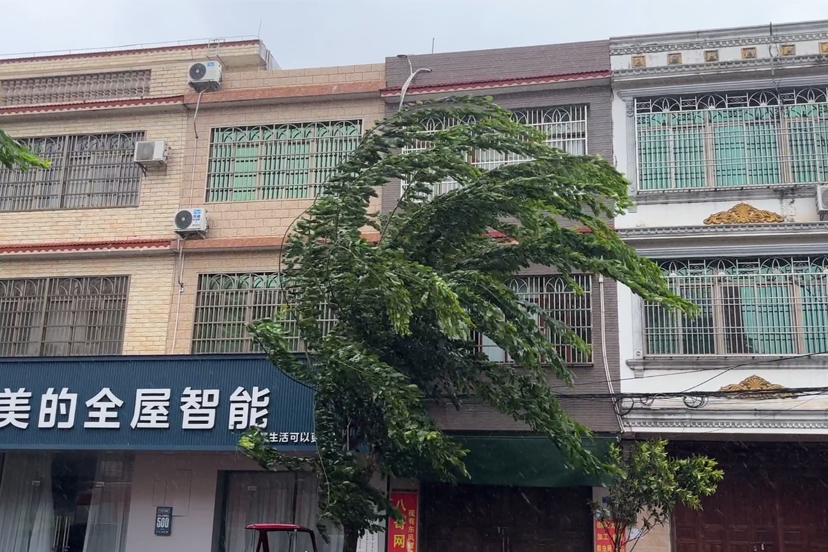 文昌市狂風(fēng)大作,廣告牌飛舞、樹(shù)木倒塌。
