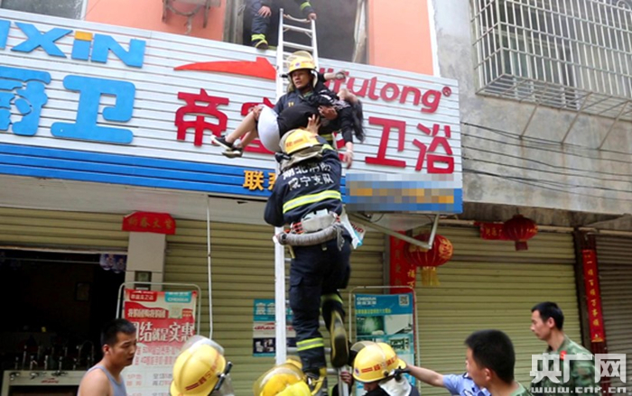 湖北咸寧:孕婦被困失火民房 消防架9米拉梯救出