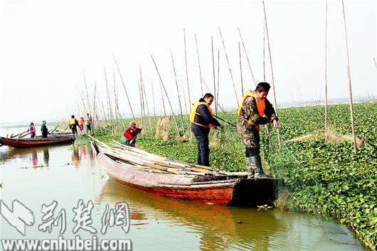 圖為昨日沙洋縣后港鎮港口村漁民開(kāi)始拆除長(cháng)湖圍欄圍網(wǎng)。(記者 楊富春 視界網(wǎng) 何長(cháng)青 攝)