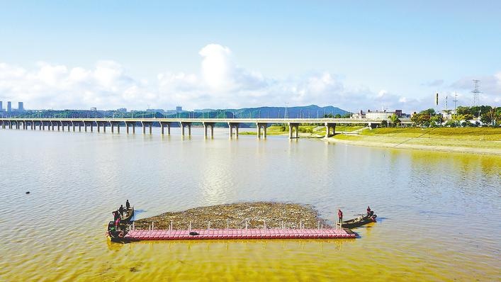 9月20日,清漂隊員在丹江口庫區鄖陽(yáng)段漢江水域清理漂浮物。