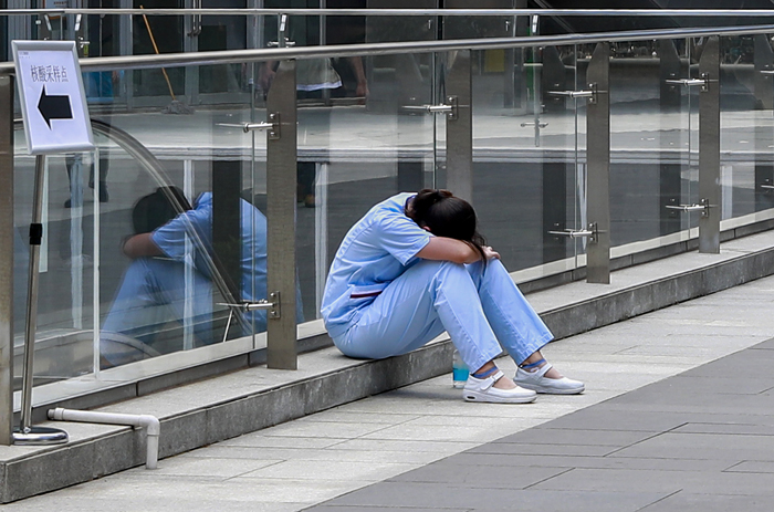 圖為:核酸采樣點(diǎn)旁,一名輪換下來(lái)的醫護人員正在休息 央廣網(wǎng)發(fā) 通訊員供圖