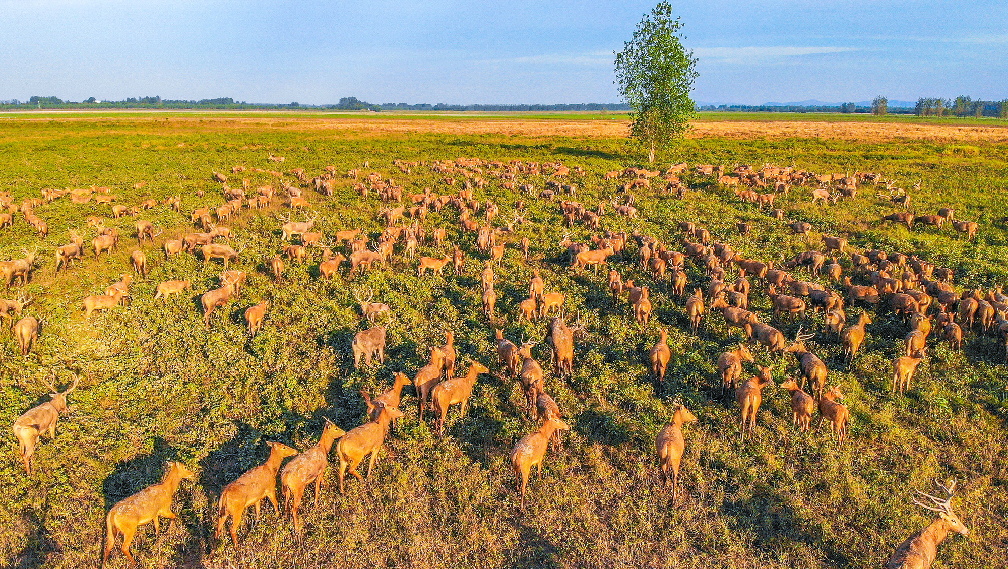 蜿蜒的長(cháng)江故道,碧波輕漾,一頭圓頭圓腦的江豚躍出水面,劃出一道銀色弧線(xiàn);不遠處的濕地深處,成群麋鹿悠然踱步,呦呦鹿鳴回蕩在晨曦之中。這里是湖北石首,長(cháng)江“九曲回腸”荊江段上一片生機盎然的生態(tài)綠洲。