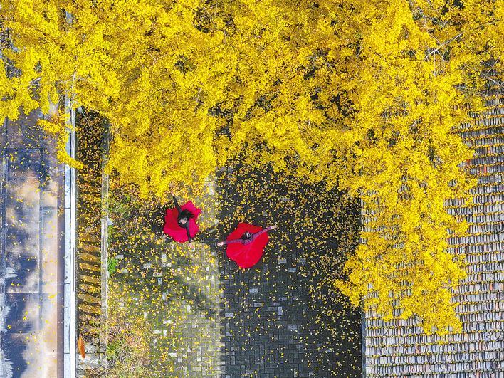 10月30日,?倒偕角赉y杏樹(shù)進(jìn)入一年中最輝煌的時(shí)節。這棵穿越上千年的古樹(shù),此刻正披著(zhù)最華美的金裳。