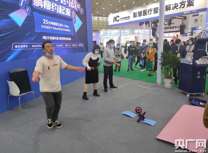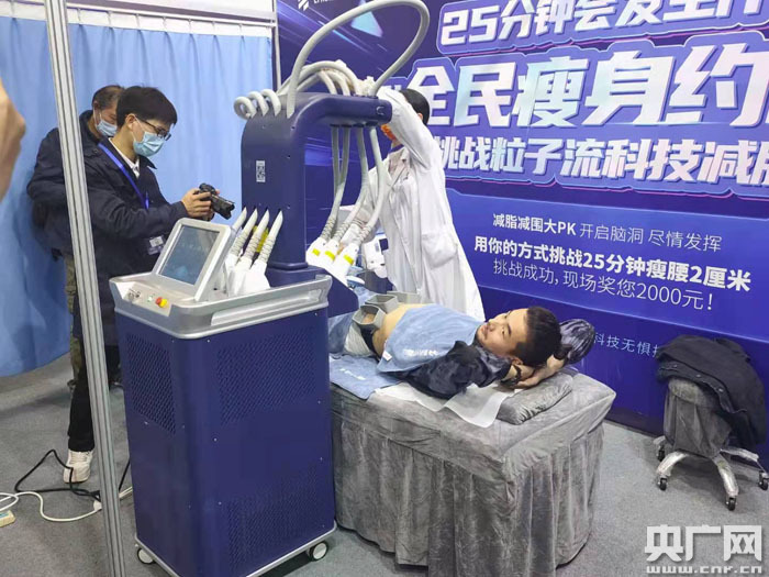 “加油跳,跳滿(mǎn)25分鐘,只要沒(méi)有像他們說(shuō)的減脂成功,我們就能得到獎勵”在該展館的醫普茂展區,一名參與“全民瘦身約戰”的女孩對同伴喊道;顒(dòng)現場(chǎng),不少參觀(guān)者踴躍參加25分鐘減圍挑戰,但在經(jīng)過(guò)約十分鐘的跳繩與搖健身環(huán)后均“敗下陣來(lái)”。隨后,該參展商向大家介紹了核心“黑科技”——粒子流轟脂科技,并邀請參展人群進(jìn)行體驗。