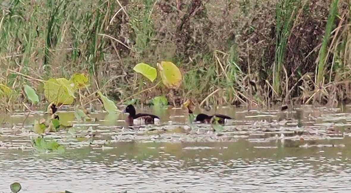 ▲藏身荷塘中的兩只青頭潛鴨 武漢市觀(guān)鳥(niǎo)協(xié)會(huì )供圖