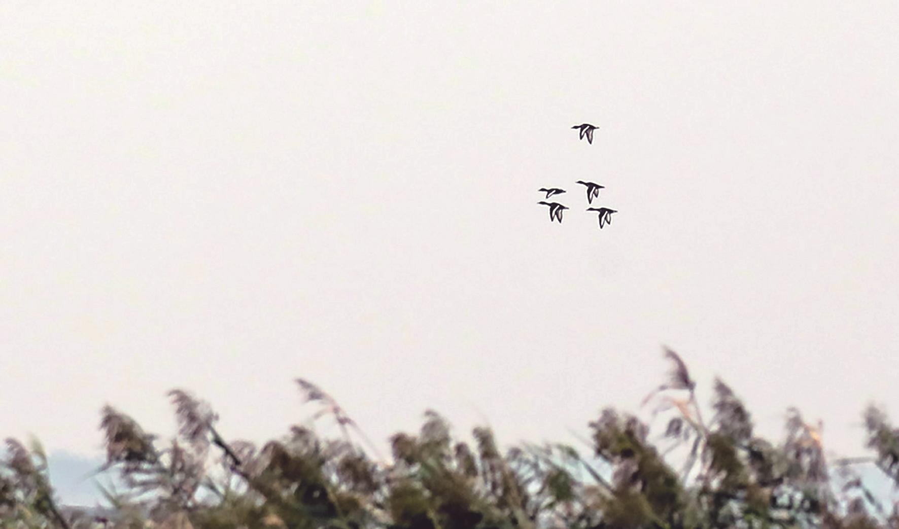 17日上午9時(shí)許,武漢市觀(guān)鳥(niǎo)協(xié)會(huì )副會(huì )長(cháng)姚波帶領(lǐng)11名調查人員對蔡甸沉湖國際重要濕地進(jìn)行生物多樣性調查。當時(shí)一片幾個(gè)足球場(chǎng)大的水塘上,100多只綠頭鴨和1000多只羅紋鴨已如期遷徙至此,唯有兩只青頭潛鴨在一旁單獨活動(dòng);另外,距此水塘2公里左右的荷塘里,又發(fā)現兩只青頭潛鴨,大家精神振奮。之后,姚波從一張抓拍的鳥(niǎo)兒空中飛行照片中驚喜地發(fā)現,自由飛翔的5只鴨,原來(lái)也是青頭潛鴨。