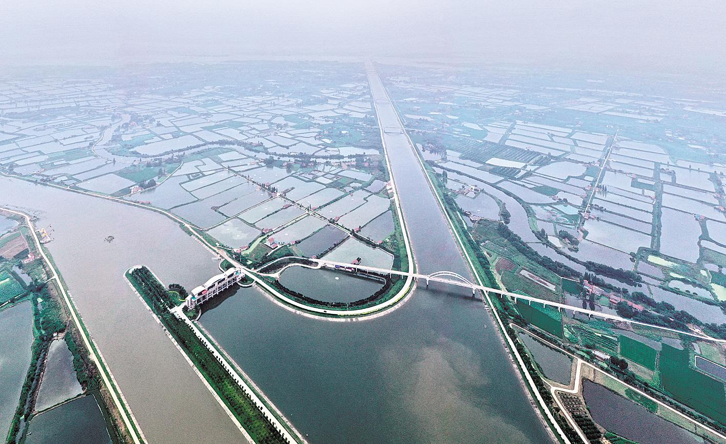 7月14日,為減輕長(cháng)湖防汛壓力,引江濟漢工程開(kāi)始為長(cháng)湖撇洪。圖中河道,左為連接長(cháng)湖的拾橋河道,右為引江濟漢主干渠。 (湖北日報全媒記者 劉曙松 通訊員 黃志剛 攝)