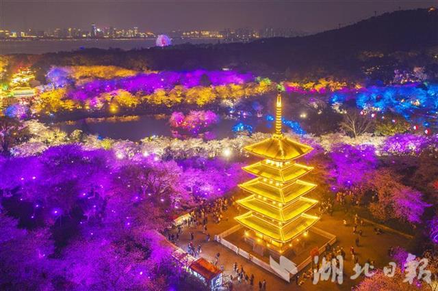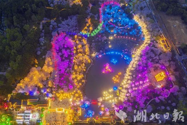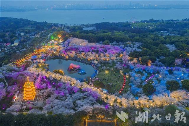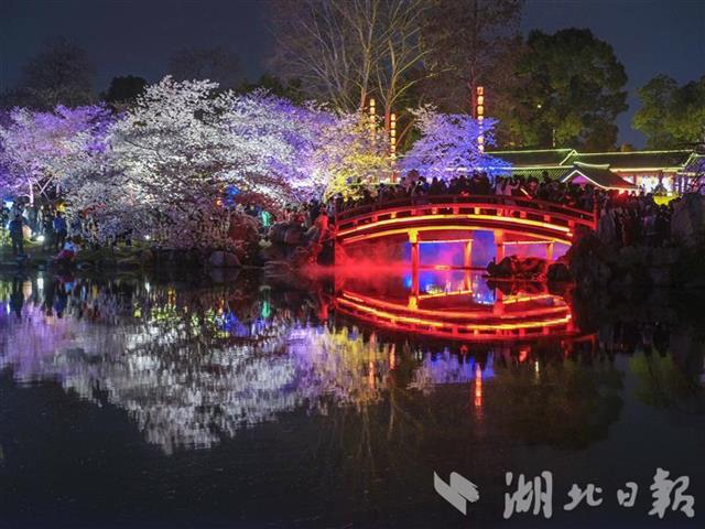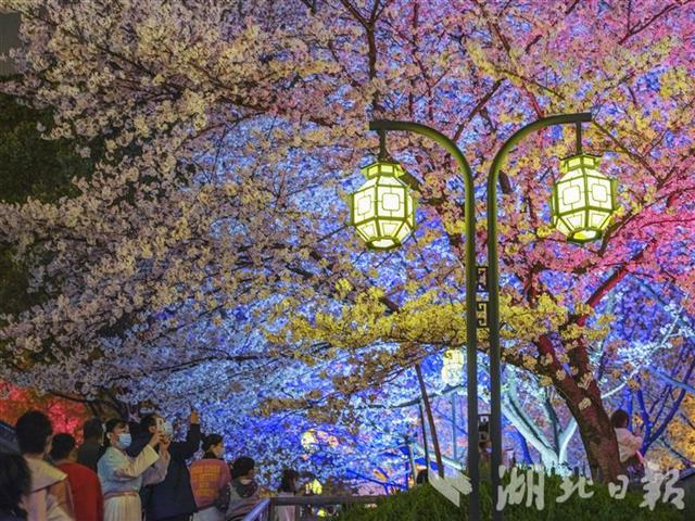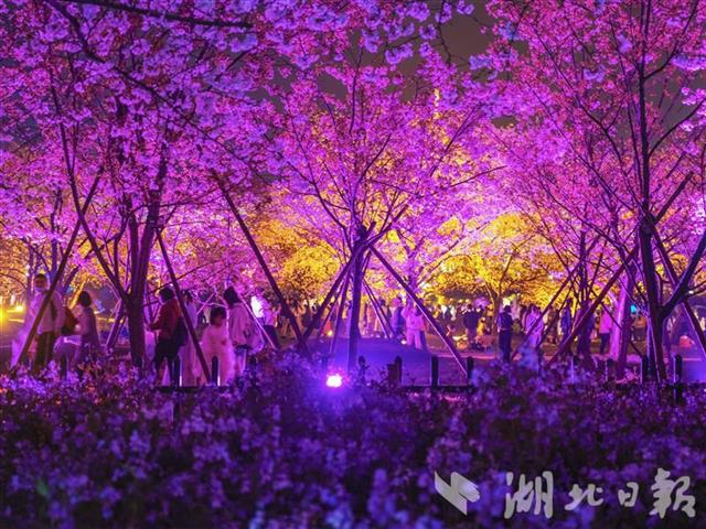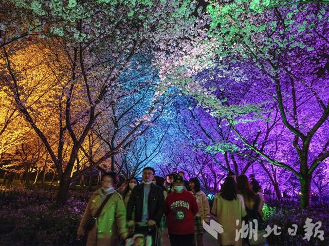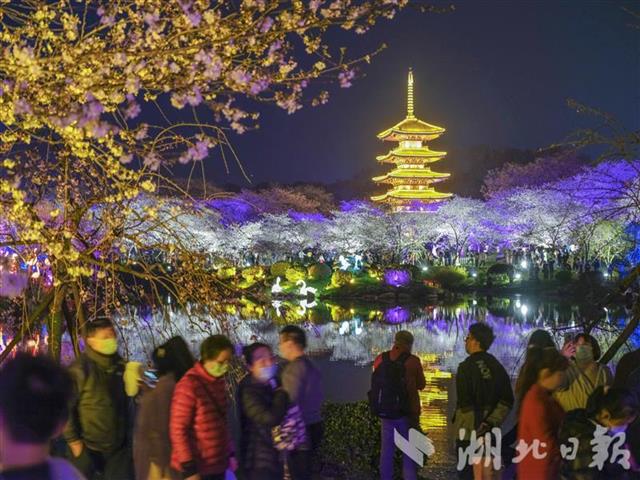 3月14日,武漢東湖櫻花園內1萬(wàn)余棵櫻花樹(shù)紛紛進(jìn)入盛花期。夜幕降臨,燈光璀璨,夜賞櫻花的游客摩肩接踵。13日至14日正逢周末,前來(lái)武漢東湖櫻花園觀(guān)賞櫻花的游客爆棚,兩天達8萬(wàn)余人,創(chuàng )出櫻花季游客人數新高。