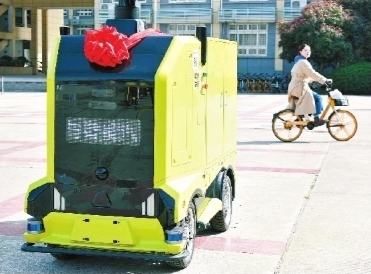 無(wú)人駕駛物流車(chē)在校園行進(jìn),吸引大學(xué)生眼球。