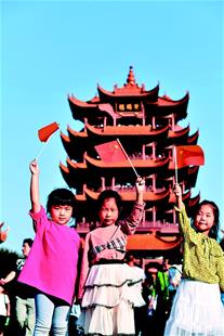 圖為:10月4日,武漢黃鶴樓景區,3名外地小游客揮舞著(zhù)手中的國旗。(湖北日報全媒記者 魏錸 攝)