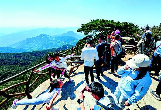 圖為:10月3日,在羅田縣薄刀峰山頂,游客觀(guān)賞美麗的大別山景色。(湖北日報全媒記者 張朋 通訊員 劉世民 攝)