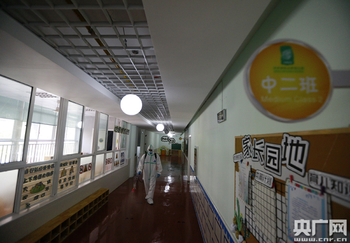 圖為:2020年8月28日,在湖北省武漢市華中師范大學(xué)附屬鐵橋幼兒園內,消防員正在對走廊區域進(jìn)行全面消殺。(央廣網(wǎng)發(fā) 通訊員王方攝)