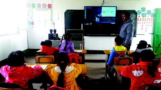 昨日下午3點(diǎn),在距離麻城市區30公里外的乘馬崗鎮胡家墩教學(xué)點(diǎn),8歲的一年級學(xué)生胡才英和班上其他7個(gè)孩子一起,正在班主任胡應聰的輔導下,通過(guò)電視學(xué)習網(wǎng)上課程。