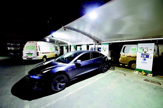 圖為:8月28日晚,一輛特斯拉電動(dòng)車(chē)在武漢徐東大街的一家充電站充電。該車(chē)充滿(mǎn)約60度電,電費不足70元,可行駛近500公里。