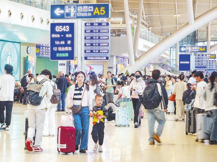 9月30日14時(shí)30分,漢口火車(chē)站到達客流和出發(fā)客流同步迎來(lái)高峰。候車(chē)大廳高峰小時(shí)發(fā)送旅客突破2萬(wàn)人次。