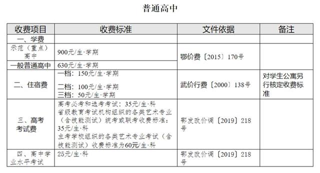 武漢市普通高中收費項目,包括學(xué)費、住宿費、高考考試費。其中,示范(重點(diǎn))高中每學(xué)期學(xué)費900元/生,一般普通高中630元/生。住宿費分3檔:150元/生、100元/生、50元/生,學(xué)生公寓另行核定收費標準。
