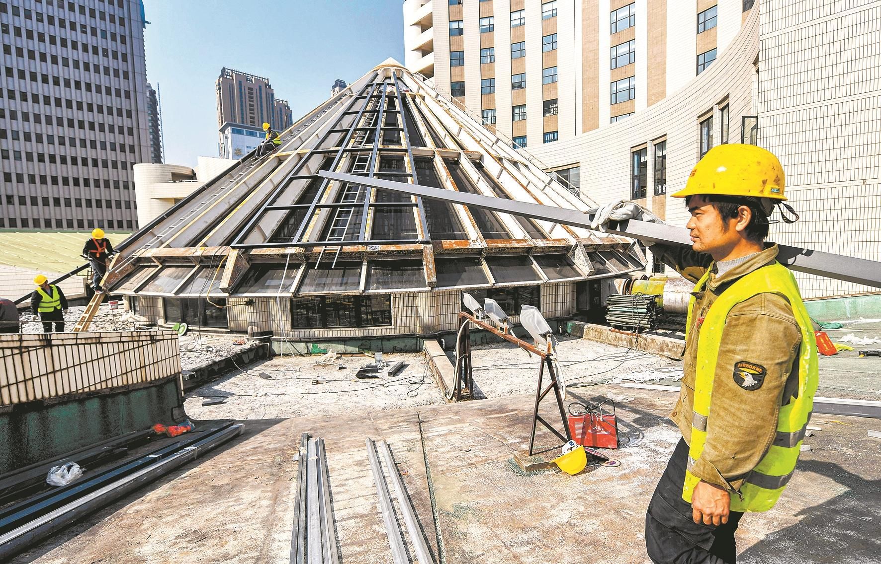 “為了換頂,我們先搭建了樓下的腳手架,因為高度有24米,工程量大,搭了一個(gè)星期,頂上的準備工作做好之后,接下來(lái)就是一塊一塊測量玻璃,根據每一塊的尺寸定制新玻璃,最后一塊一塊地更換,總共更換面積有800多平方米!笔┕けO理預估,換頂從準備工作到完工需要耗時(shí)45天左右。