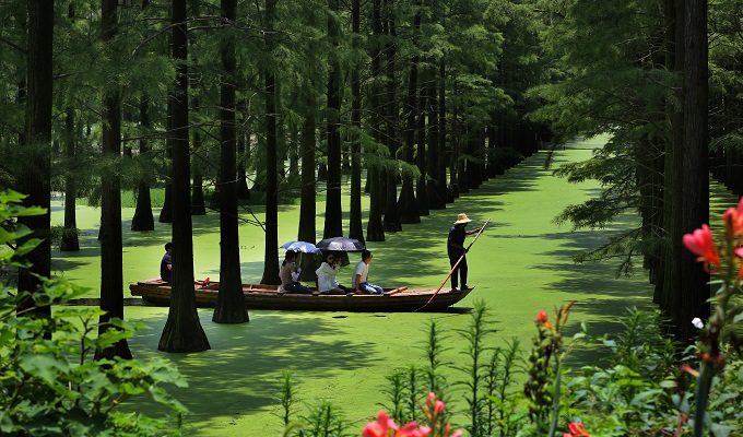 圖為:游人乘船從漲渡湖濕地水杉林中劃過(guò) 央廣網(wǎng) 發(fā) 通訊員 邱新明 攝