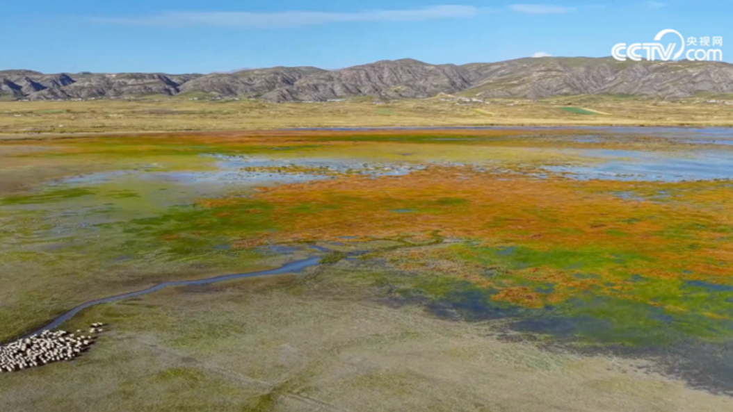 在青海省海南藏族自治州共和縣,秋日的尕海灘草原鋪著(zhù)金毯,羊群如散落的云朵。牧羊女揮鞭隨行,澄澈水面上,斑頭雁振翅掠過(guò),牧歌與雁鳴交織,繪就一幅靈動(dòng)的高原秋牧圖。
