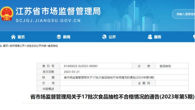3月21日,江蘇省市場(chǎng)監督管理局發(fā)布17批次食品抽檢不合格情況的通告(2023年第5期)。內容顯示,宿遷、鎮江、南京、無(wú)錫、鹽城等多地經(jīng)營(yíng)企業(yè)銷(xiāo)售和使用的食品、餐飲具抽檢不合格。