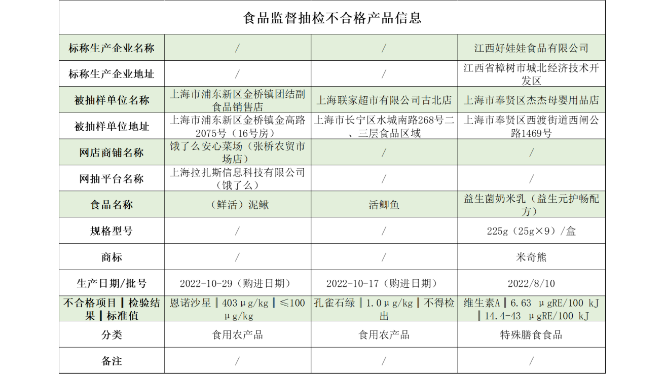 上海抽檢食品1066批次 泥鰍、鯽魚(yú)等3批次不合格